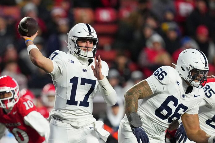 PISCATAWAY, NEW JERSEY – NOVEMBER 29: Ethan Grunkemeyer #17 of the Penn State Nittany Lions passes the ball against the Rutgers Scarlet Knights in the first half at SHI Stadium on November 29, 2025 in Piscataway, New Jersey. (Photo by Mitchell Leff/Getty Images)