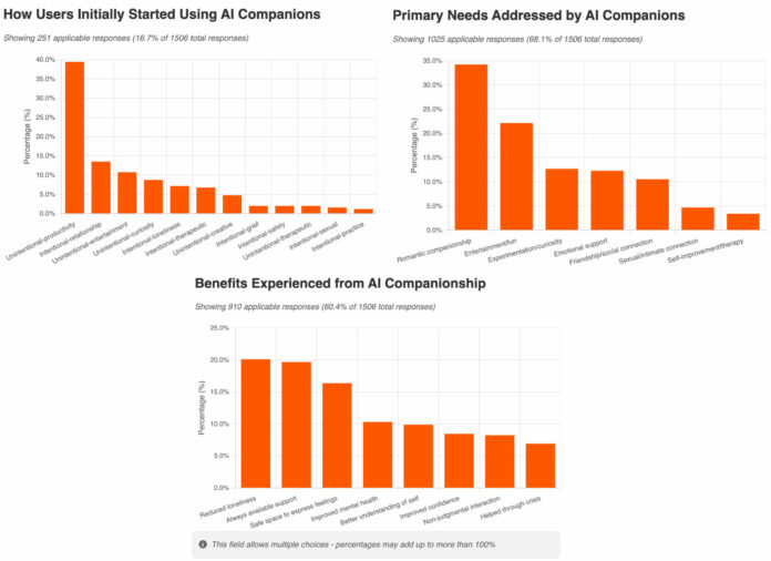 Reported benefits centered on addressing social isolation and emotional needs. Users frequently cited reduced loneliness (12.2%) and always-available support (11.9%) as primary advantages, emphasizing the temporal accessibility that distinguishes AI from human relationships. The provision of a safe space for emotional expression (9.9%) and non-judgmental interaction (5.0%) highlighted the psychological safety users experienced. Mental health improvements were explicitly reported by 6.2% of users, with 4.2% crediting AI companions with helping them through crises. Additionally, 6.0% reported better self-understanding through AI interactions, suggesting these relationships facilitate introspection and personal growth. These findings indicate that companion AI systems serve complex psychological and social functions, often addressing unmet needs in users’ human relationships while providing unique affordances unavailable in traditional social contexts.