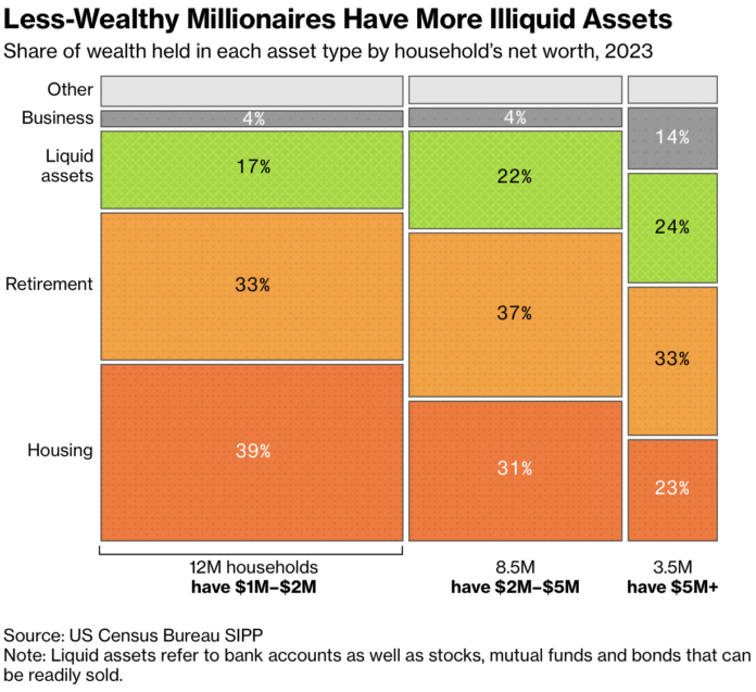 Everyone loves reading about millionaires who don’t have enough liquidity to buy things, but the seven-figure status is not what it once was. For Bloomberg, Andre Tartar, Ben Steverman, and Stephanie Davidson show the increasing number of millionaire households who have most of their net worth tied up in housing and retirement accounts.