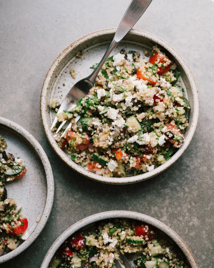 Most of my work is focused on dinner plans. I always make more than we need, and since my husband and I work from home, we usually eat leftovers for lunches. Due to current circumstances, I’m getting lots of questions from you all about lunch ideas. Everyone is home and everyone is eating allllllll day long! I made this quinoa dish last week and thought I’d put notes here. I’ve written similar things before and it’s super easy, but it doesn’t sound like many of us have the bandwidth or grocery trips to get fussy right now.