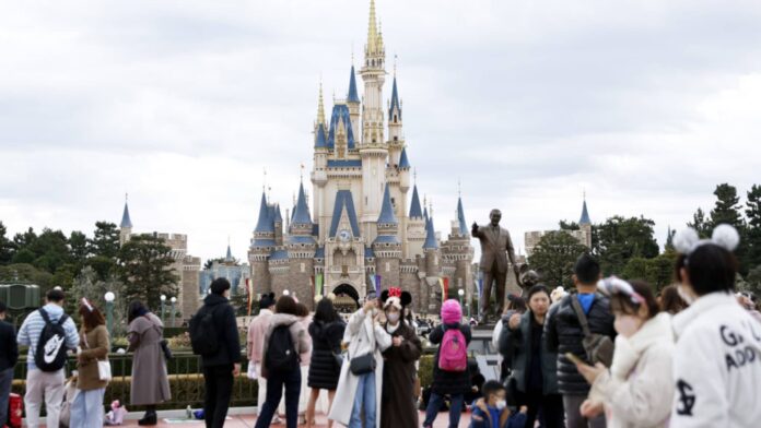 Visitors in front of the Cinderella Castle at Tokyo Disneyland in Tokyo, Japan on Jan. 17, 2023.