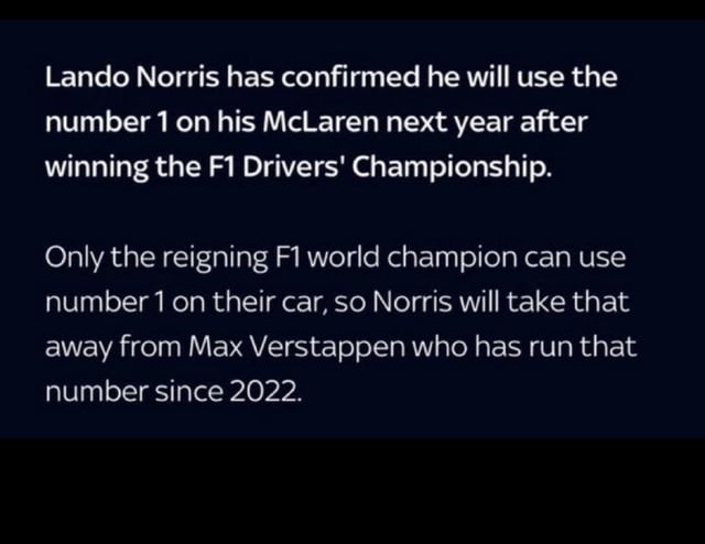 “it’s tradition. it’s there for a reason. it’s there because you can go and try grab it and you can work hard to try and get it. all of us as a team that gets to have a role in mclaren, or my car, will get to wear that with pride. it’s all my mechanics, my engineers, everyone that's part of mclaren gets to have that acknowledgement too. so it's not for me, it's for them as well. it’s their pride, knowing that they put a lot of work and effort into everything that they can also go 'we're number one'. it’s not as cool when you say 'we are number four' so they will be even happier than i am!”- lando for sky sports submitted by /u/Few-Albatross2984 |