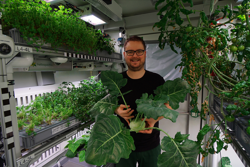 Technician Paul Zabel in EDEN ISS, holding kohlrabi.Photo: EDEN ISS.