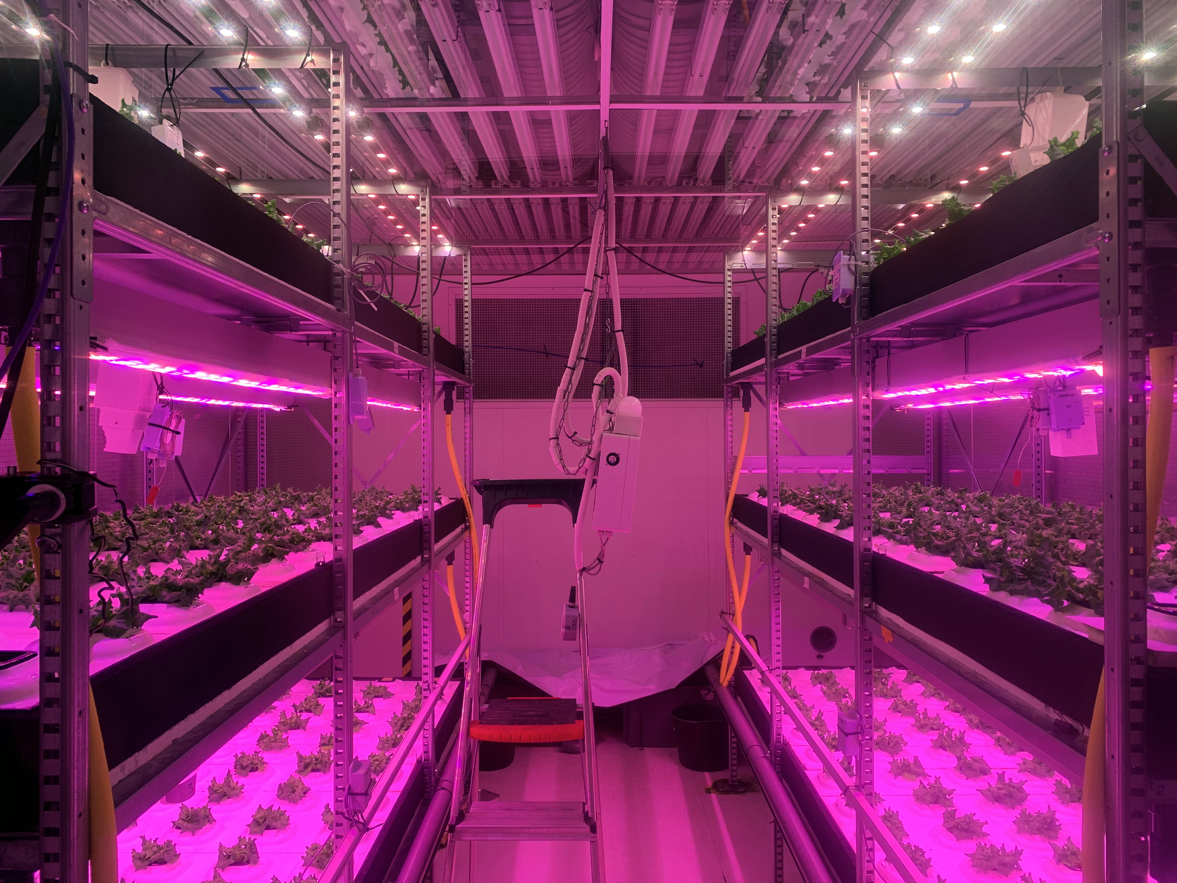 Plants growing under pinkish light in Esther Meinen and Luuk Graaman’s test greenhouse in Wageningen. Photo: Nicola Twilley.