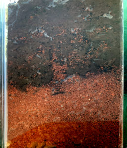 Martian soil in a terrarium in Wieger’s office; the layer in which the worms have been active is quite distinct. Photo: Nicola Twilley.