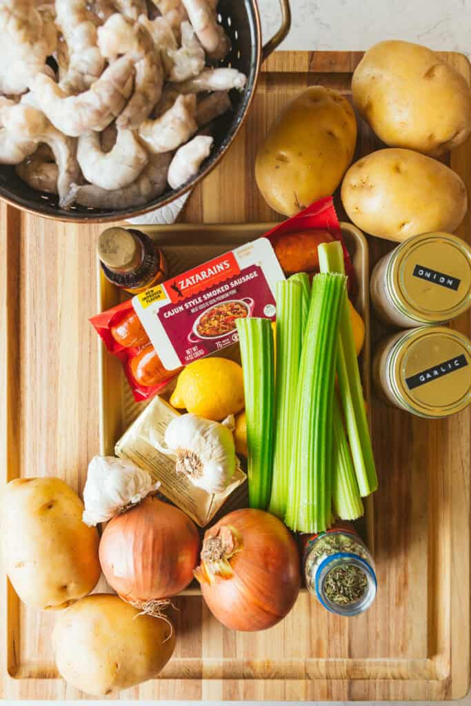 Here are the ingredients you’ll need for this stovetop shrimp boil recipe: